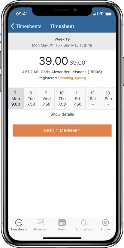 The sums per day are followed by a link, “Show details”, that enables you to expand the screen to detailed view mode. You can read more about this in chapter “Timesheet Week-screen – Detailed View”.