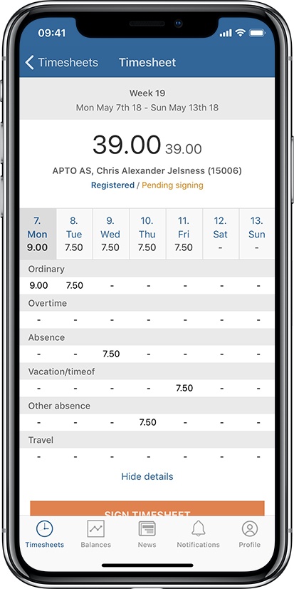 When you have clicked “Show details” in the timesheet week-screen, the screen is expanded to display sum of hours per hours type group, per day.