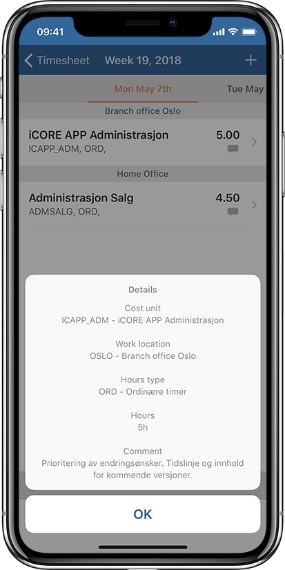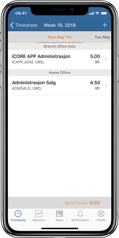 Registered hours and wage allowances are grouped per work location and cost unit, hours type and other dimensions that have been selected in your business’ iCORE-installation. If a comment has been attached to a registered occurrence, this is indicated by an icon below the number of hours.